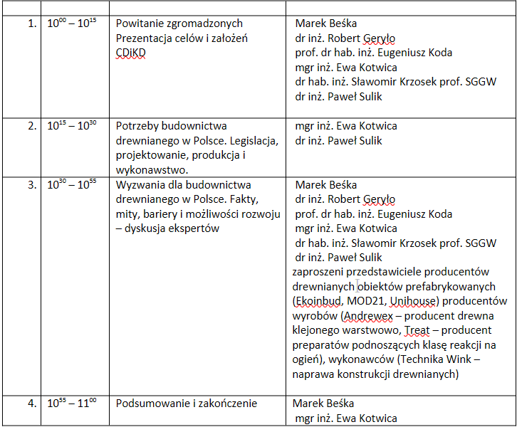 Ramowy plan panelu Centrum Drewna i Konstrukcji Drewnianych przy SGGW – odpowiedź na potrzeby budownictwa drewnianego w Polsce.