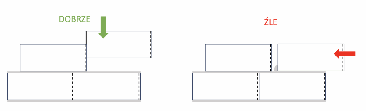 Zaprawa na bloczkach powinna być równomiernie rozprowadzona po całej jego powierzchni wspornej. Niedopuszczalne jest nakładanie zaprawy wąskimi pasmami. W przypadku bloczków gładkich (bez profilowań typu pióro + wpust) oraz w miejscach łączenia docinanych elementów (np. narożniki), czyli wszędzie tam, gdzie pióro – wpust został usunięty należy pamiętać o wypełnianiu zaprawą również powierzchni pionowej bloczków.