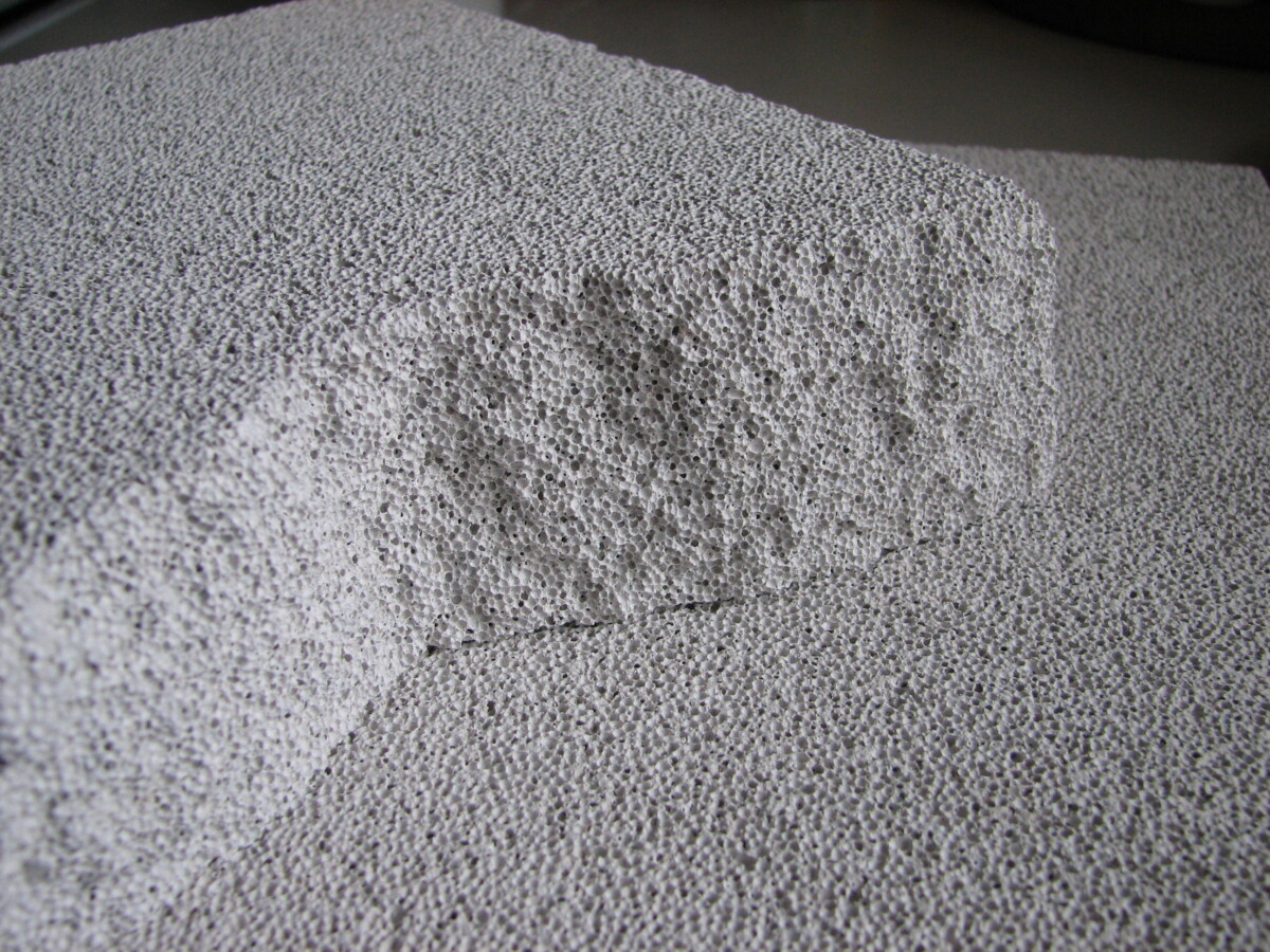 Charakterystyczna porowata struktura betonu komórkowego. Gołym okiem można zobaczyć kuliste pory powietrzne o wielkości około 1 mm.