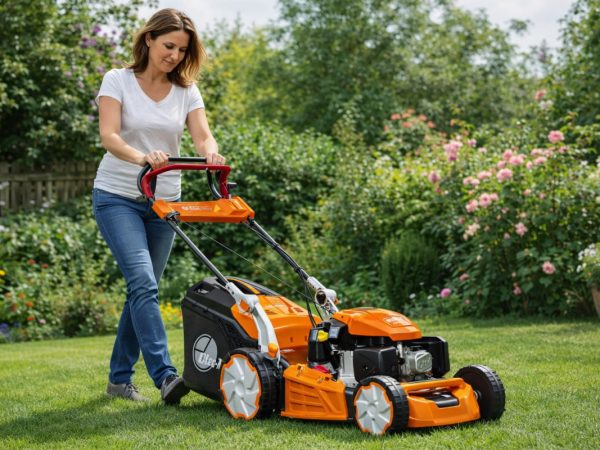 Rozwiązanie to pełni również funkcję praktyczną podczas przechowywania. Po złożeniu uchwytu kosiarkę można ustawić w pozycji pionowej, opierając ją stabilnie na kołach i wsporniku. Dzięki temu zajmuje ona znacznie mniej miejsca, co docenią szczególnie użytkownicy dysponujący ograniczoną przestrzenią w garażu lub pomieszczeniu gospodarczym.