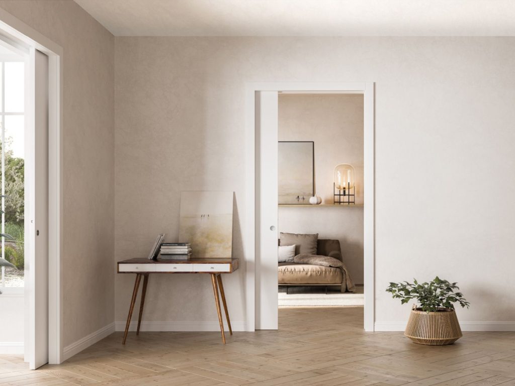 Drzwi przesuwne chowane w ścianę bez ościeżnicy – Drzwi chowane w ścianę bez ościeżnicy, nie posiadają drewnianych elementów wykończeniowych. Skrzydło drzwiowe wsuwa się bezpośrednio w ścianę. Perfekcyjny wybór dla minimalistów! Drzwi bez ościeżnicy tworzą jednolitą powierzchnię, która stapia się ze ścianą, zapewniając nowoczesny i schludny wygląd. Doskonale nadają się do małych pomieszczeń, gdzie każdy centymetr ma znaczenie. Bez dodatkowych elementów, drzwi te wyglądają lekko i elegancko, nie przyciągając uwagi.