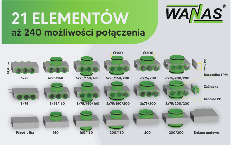 Jedyny taki system na rynku – zaledwie 21 elementów daje aż 240 możliwych konfiguracji. Skrzynki wyróżniają się na tle konkurencji solidną konstrukcją z ocynkowanej stali o grubości 0,7 mm oraz zastosowaniem gumowych króćców z potrójnym uszczelnieniem , które gwarantują znakomitą szczelność połączenia.