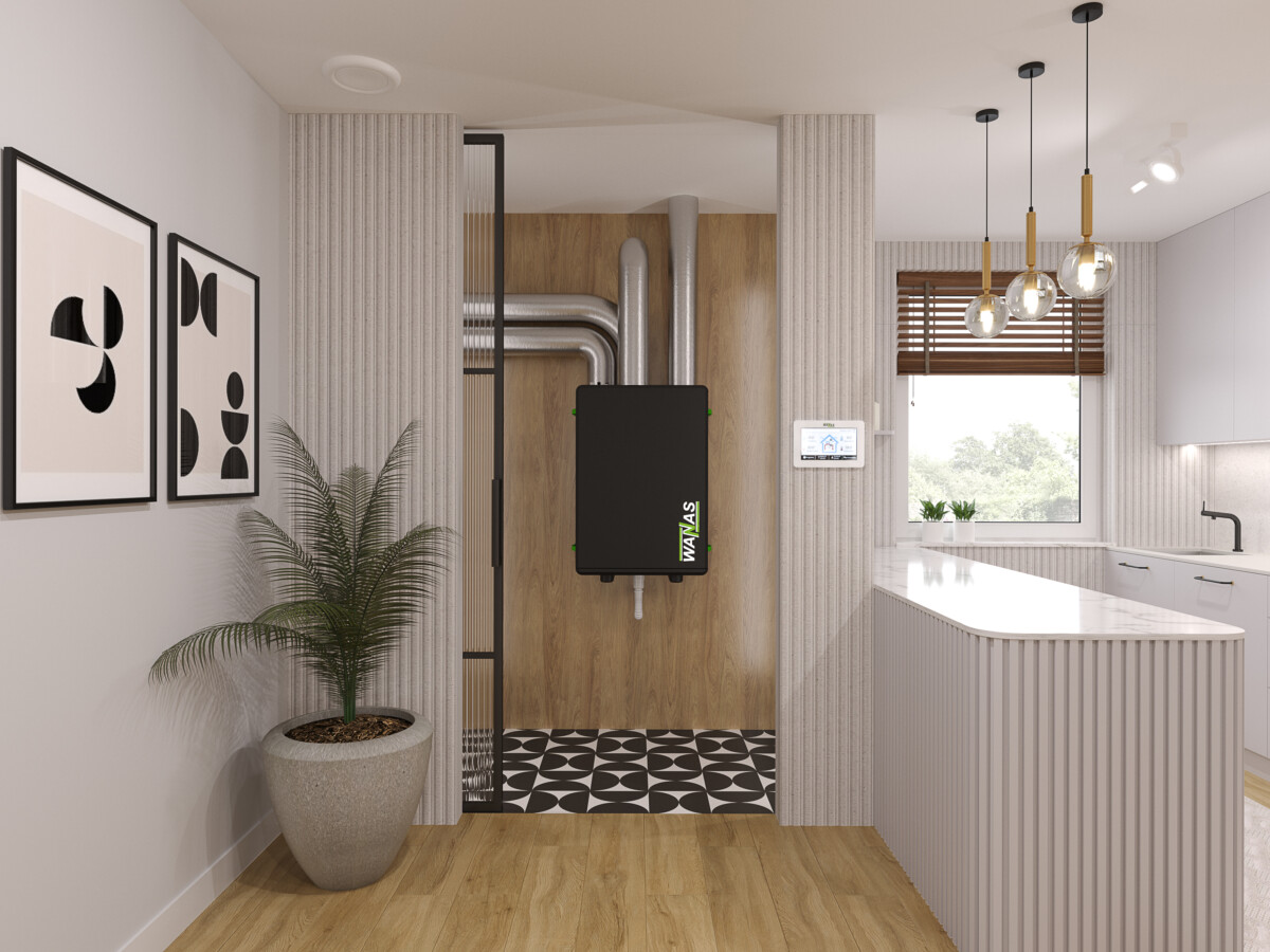 Rekuperatory WANAS BLACK to nowoczesne i kompaktowe centrale wentylacyjne, które łączą zaawansowany design z wysoką funkcjonalnością. Wykonane z wytrzymałego spienionego polipropylenu (EPP), który zapewnia znakomite właściwości izolacyjne oraz akustyczne. Dzięki lekkiej konstrukcji i dwustronnej obudowie, montaż urządzenia jest szybki i prosty. Centrale są wyposażone w dotykowy panel sterujący oraz wbudowany moduł Wi-Fi, umożliwiają pełną kontrolę zdalną za pomocą aplikacji co czyni je idealnym wyborem do nowoczesnych domów jednorodzinnych.